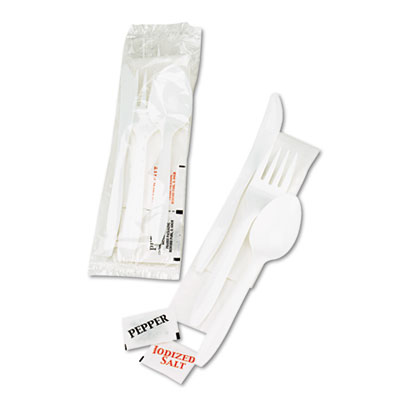 Serve any meal with this cutlery kit. Each pre-packaged wrapping contains a plastic medium weight fork, spoon and knife, as well as salt and pepper packets and a napkin. Utensils Type: Tableware/Napkin/Condiment; Material(s): Polypropylene; Color(s): White.