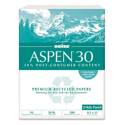 CAS054901P ASPEN 30% Recycled Office Paper, 3-Hole, 92 Bright, 20lb, Ltr, White, 5000/Ctn By CASCADES