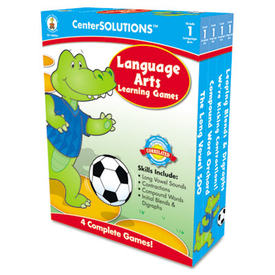 Ideal for centers and cooperative learning, CenterSOLUTIONS™ contains four complete language arts learning games in each set. Every game focuses on a different language skill, making it perfect for differentiated instruction, and includes a game board, four game pieces, playing cards, a die and a storage box. Supports NCTM standards. Includes The Long Vowel 500, Compound Word Orchard, We're Kicking Contractions and Leaping Blends & Digraphs. Games/Manipulatives Type: Language Arts Games; Age Recommendation: Grade 1; Number of Cards: 120.0.