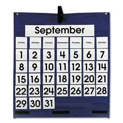 Create your own calendar each month. 43 pockets, plus cards for days of the week and dates. Flame-retardant; durable construction; sturdy grommets for easy hanging. Pocket Chart Type: Calendar; Total Pockets: 36; Width: 25".