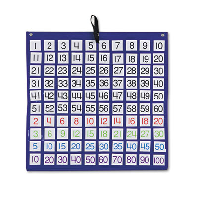 Illustrate fundamental math concepts, patterns, multiples. Features 100, 2" wide clear acrylic pockets and includes cards labeled 1-100 with multiples of 2, 3, 5 and 10 highlighted in different colors. Durable flame-retardant nylon construction with grommets for hanging. Pocket Chart Type: Math; Total Pockets: 100; Width: 26".