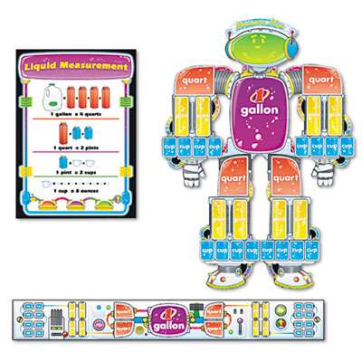Teach and reinforce liquid measurement skills with the Measure Man. A fun way for kids to learn what makes up a gallon, quart, pint and cup. Set includes Measure Man, a liquid measurement chart, 11 border strips and resource guide. Theme: Measure Man; Width: 27 1/2".