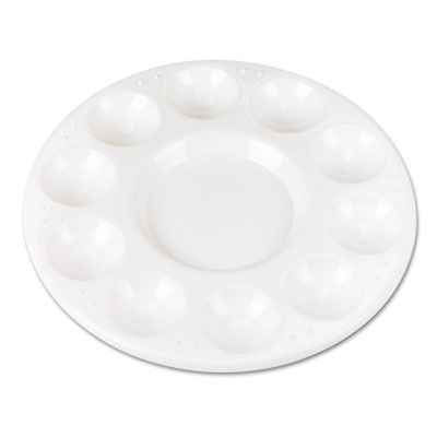Durable white plastic round trays with ten paint wells. Art Containers Type: Paint Tray; Material(s): Plastic; Color(s): White.