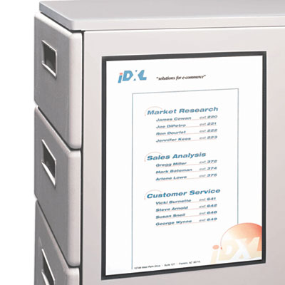 Keep your desk uncluttered and organized. Attach phone lists, photos, certificates and more to file cabinets, desks or any metal surface. Use horizontally or vertically. Polypropylene insertable holder with black backing. Panel Accessory Type: Repositionable Display Holder; Width: 8 1/2".