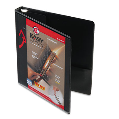 EasyOpen® locking Slant-D® ring mechanism instantly engages when closed, eliminating two-step and two-hand operation. No scratched desks or bookshelves from triggers that don't close up. Opens and closes with just the touch of one finger which earned this binder the "Ease-Of-Use" Commendation from the Arthritis Foundation. Safer and easier to use than other metal ring binders—no more pinched fingers. Holds 25% more than conventional round ring binders. Clear overlay on front cover, back cover and spine allows insertion of custom title sheets for a professional looking presentation. Capacity Range [Max]: 1"; Sheet Capacity: 200; Color(s): Black.