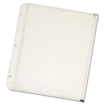 Zippered pocket expands 1/2" to hold up to 100 sheets of paper, notes or other accessory items. Three-hole punched to fit standard ring binders. Non-stick, transfer-safe polypropylene. Color(s): Clear; Height: 11"; Width: 8 1/2".