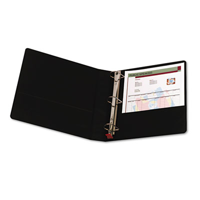 Clear, wraparound pocket allows you to customize front, back and spine with a single 11 x 8-1/2 insert. Received the "Ease-of-Use" Commendation from the Arthritis Foundation®. No pinch rings open, close and lock with one touch. Front and back inside cover pockets. Capacity Range [Max]: 1 1/2"; Sheet Capacity: 325; Color(s): Black.