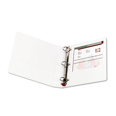 Clear, wraparound pocket allows you to customize front, back and spine with a single 11 x 8-1/2 insert. Received the "Ease-of-Use" Commendation from the Arthritis Foundation®. No pinch rings open, close and lock with one touch. Front and back inside cover pockets. Capacity Range [Max]: 1 1/2"; Sheet Capacity: 325; Color(s): White.