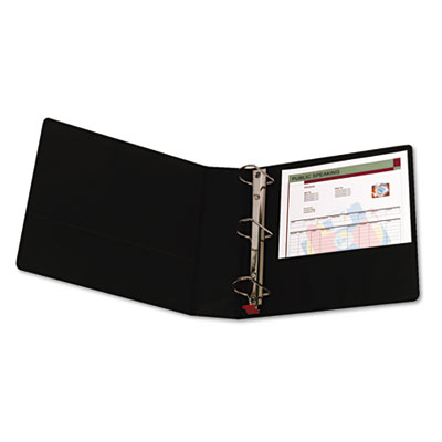 Clear, wraparound pocket allows you to customize front, back and spine with a single 11 x 8-1/2 insert. Received the "Ease-of-Use" Commendation from the Arthritis Foundation®. No pinch rings open, close and lock with one touch. Front and back inside cover pockets. Capacity Range [Max]: 2"; Sheet Capacity: 500; Color(s): Black.