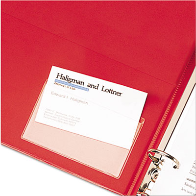 Insert a business card into these clear pockets to personalize brochures, ring binders or business presentations. Creates a more professional-looking presentation. Lets you identify ownership of policy manuals, reference books, and more. Self-adhesive backing holds them firmly in place. Archival-safe poly that will not transfer ink or toner. Color(s): Clear; Size: 3 3/4 x 2 3/8.