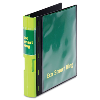 Molded with 90% recycled polypropylene; binder is 100% recyclable, including the rings, with no disassembly required. Heavyweight construction—guaranteed five years not to crack or break. Durable living hinge is cold-crack tested to 10°F. One-touch trigger opens rings to two positions: halfway for easy page viewing or completely for loading. Clear overlay on front cover holds your custom title sheet. Ergonomic grip on spine for quick shelf removal. Capacity Range [Max]: 2"; Sheet Capacity: 350; Color(s): Black; Green.