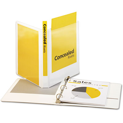 Safe for all documents including photographs, the acid-free poly material will not stick to cover inserts or materials stored inside. Clear overlay showcases customized title sheets on the front cover, back cover and spine that you create. Dual opening and closing triggers latch and unlatch the round metal rings keeping your documents safe and secure. Hidden rivet construction adds to the clean, professional appearance. Horizontal pockets on inside front and back covers expand binder's storage capabilities for loose or unpunched sheets. Capacity Range [Max]: 1"; Sheet Capacity: 225; Color(s): White.