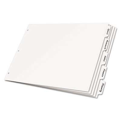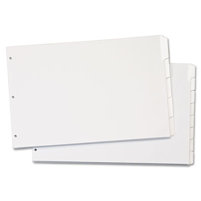 Special coated tabs accept pen, pencil or nonpermanent marker then erase clean for repeated reuse. Three-hole punched for tabloid-size binders with reinforced holes for added durability. Instant index tabs–no time consuming tab typing or insertion. Tab Style: 5-Tab; Tab Color(s): White; Index Divider Size: 11 x 17.