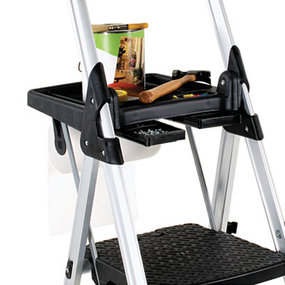 Lightweight aluminum frame supports three large heavy-duty injection molded polypropylene resin steps. Extra-large 16 1/4w x 16 1/4d top platform step. Large, non-marring, skid-resistant feet provide stability. WARNING: Metal ladders conduct electricity. Do not use where contact may be made with live electrical circuits. Number of Steps: 3; Step Stools Type: Folding Step Stool; Working Height: N/A; Frame Material: Aluminum.