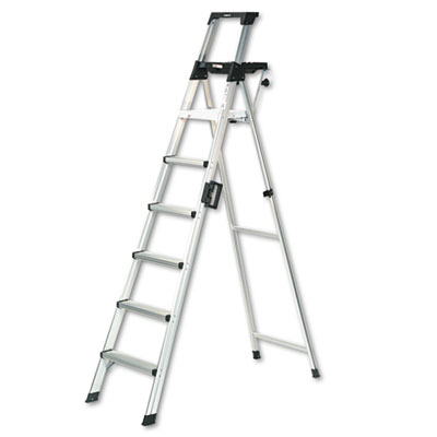 For industrial, construction, building, roofing and general contracting use. Lightweight and durable, with large platform top step for comfortable working space. Non-marring, skid-resistant, stabilizing feet. Folds down to 5-1/2" deep for storage. All-in-one leg lock and carry handle. Comfort hand grips for an easy climb. Material(s): Aluminum; Color(s): Aluminum; Number of Steps: 6.