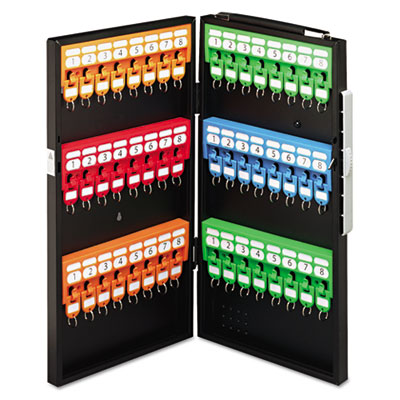 Stylish security cabinet for keys has carry handle for portable use. Easy to organize and track with numbered, colored key tags and hangers. Easy to lock securely. Wall mounting option. Key Capacity: 48; Material(s): Steel; Color(s): Black.