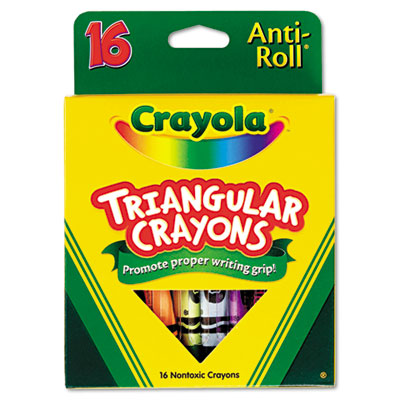 Easy-to-hold, triangular crayons won't roll off tables and desks. Combine Anti-RollŽ benefit with the grip needed for proper writing development. Non-washable formula appropriate for school-age children. Triangular shape is excellent for texture rubbing. Trilingual graphics on crayon labels. Features lift lid box and internal removable tray. Color(s): 16 Assorted; Assortment: Black;Blue;Blue Green;Blue Violet;Brown;Carnation Pink;Green;Orange;Red;Red Orange;Red Violet;Violet;White;Yellow;Yellow Green;Yellow Orange.