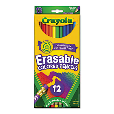 No more smudges or ripped paper! Built-in erasers allow you to correct mistakes and make changes anytime! Bright colors and smooth laydown ensure first-rate quality. Fun barrel graphics make it easy to differentiate erasable versus regular colored pencils. Pencil Type: Woodcase; Lead Color(s): 12 Assorted.