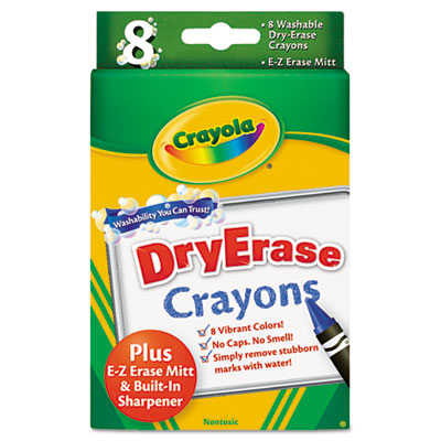 Versatile dry erase crayons brush off surfaces clean and easy. Crayons won't dry out with no odor and no caps to lose. Bold, opaque colors provide smooth laydown. Washes away from skin and most fabrics. Includes E-Z Erase Mitt for cleaning and built-in sharpener. Color(s): 8 Assorted; Assortment: Black;Blue;Brown;Green;Orange;Purple;Red;Yellow.