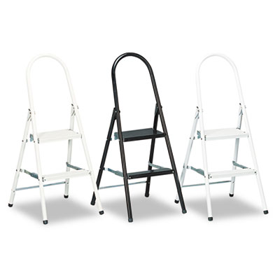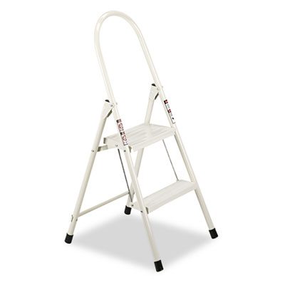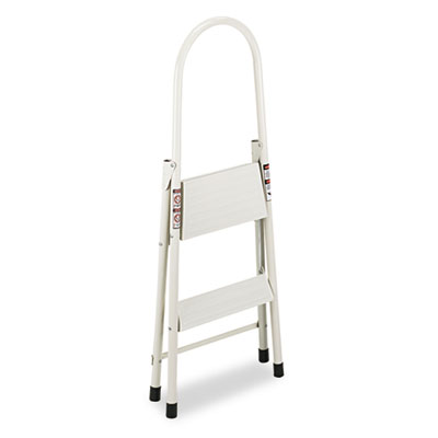 Loop top handrail, steel legs and serrated steps. Qwik Step™ feature for easier opening. Lightweight, yet sturdy ladder folds flat to only 2" deep and top step when open is 24" high. WARNING: Metal ladders conduct electricity. Do not use where contact may be made with live electrical circuits. Number of Steps: 2; Step Stools Type: Folding Step Stool; Working Height: N/A; Frame Material: Steel.