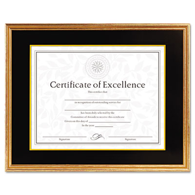 This handsome frame displays awards, certificates, diplomas or other documents. Features a solid American hardwood construction that brings a cottage-style feel. The frame has a charcoal and gold-tone mat to add elegance to your display. For your convenience, the frame hangs vertically or horizontally. Frame Type: Certificate;Document; Frame Material: Hardwood; Frame Color: Antique Gold.
