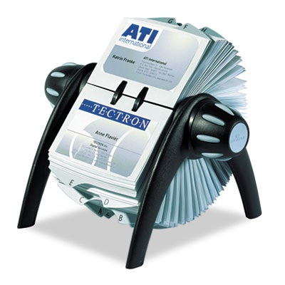Sleek-looking rotary business card file with up-to-date features like large ergonomic knobs with rubber inserts for turning ease. Rotation mechanism holds cards in place for viewing. Rubber pads on legs prevent slipping and surface scratching. Durable plastic. Stores 400 business cards in 200 double-sided clear sleeves (included). 25 (A-Z) dividers included. Rubber pads on legs. Manufacturer's one-year limited warranty. Card Holder Type: Open Rotary Business Card File; Card Capacity: 400; For Card Size: 2 7/8 x 4 1/8.