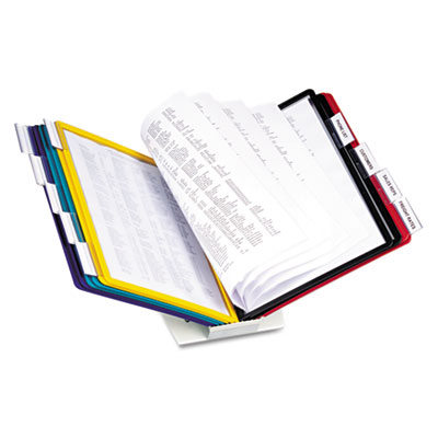 Maximize your reference organizing capabilities. Rugged metal desk stand offers ten flex panels, each with five double-sided pockets to display a maximum of ten documents per panel or 100 sheets total. Assorted panels include two each: black, blue, green, red and yellow. Includes ten snap-on tabs.
