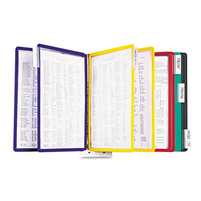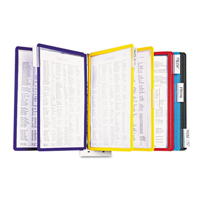 Double-sided, heavy-duty polypropylene panels with snap-on tabs. Rugged frames stand up to heavy use, while angled brackets help keep sleeves open. Expand by adding systems side by side. Wall bracket and mounting hardware included. Two each black, blue, green, red and yellow. Rack Style: Reference.
