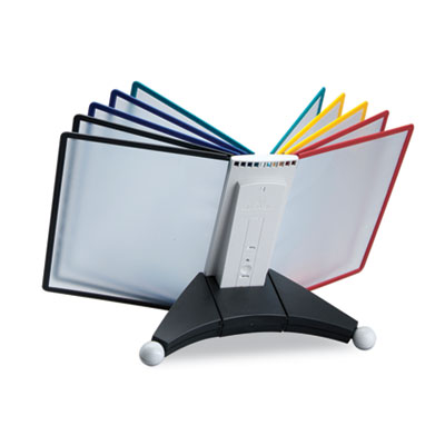 Weighted desk stand with ten double-sided, heavy-duty polypropylene panels and snap-on tabs. Holds 20 letter size sheets. Expands with Extension Set, sold separately. For custom options, can be used with Display Panels, Desk Stand or Extension Module, sold separately. Assembly required. Two each: black, blue, green, red and yellow; includes snap-on tabs. Rack Style: Reference.