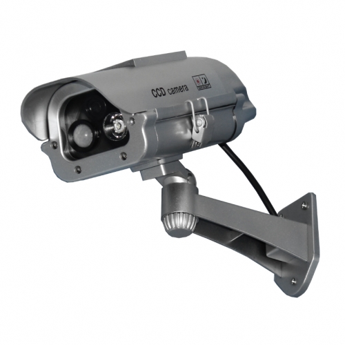 Streetwise Security Products has manufactured dummy cameras for over 20 years and has remained on the cutting edge of innovation. Our first models were just basic camera shells. Then we made them more visible with the addition of a flashing LED light. Our next improvement allowed the camera to pan back and forth when motion was detected. We then introduced solar powered LED lights in order to eliminate the cost of replacing batteries. Now we are happy to introduce the next generation of dummy cameras- solar powered motion activated strobe lights! Like a rat scurrying for cover when the lights are turned on, a criminal will flee the bright flash that comes from what they assume is a high tech security camera. The 7" IR Dummy Camera in Outdoor Housing w/ Solar Powered Motion Strobe Light can deter robbery, theft or vandalism day or night without the high cost of a real security camera. When placed in your home or business even the most sophisticated criminals will think the premises is guarded by a high-tech surveillance system and go in search of an easier target. Rain Shield so this camera can be used anywhere. The flashing LED light and flashing strobe can be powered by the sun (which charges the included rechargeable batteries). The dimensions (including the rain shield and bracket) are 10 inches x 6 inches x 7 inches. Installs quickly and easily using the included stainless steel screws. Requires two regular AA batteries (only needed if the camera will be used inside)