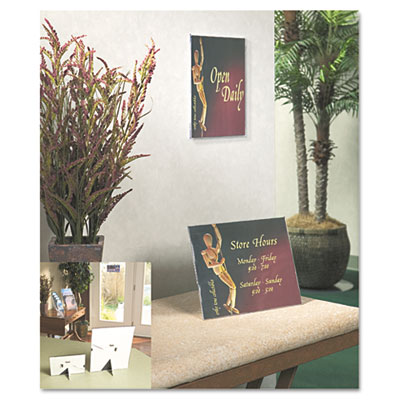 The ultimate in sign holder versatility. Desktop or wall mount in either portrait or landscape orientation. Easel back snaps out for quick conversion to desktop sign holder. Creates floating signage effect. Frame Color: Clear; Size: 5 x 7.