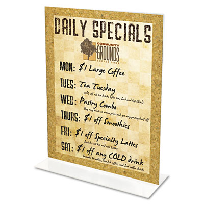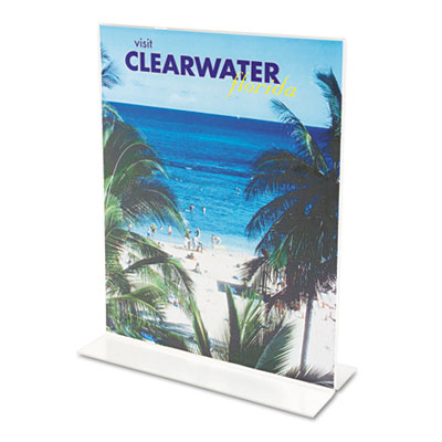 Freestanding durable plastic T-frame holder lets you move signs to where you need them most and allows viewing from two directions. Loads from the bottom. Frame Color: Clear; Size: 8 1/2 x 11.