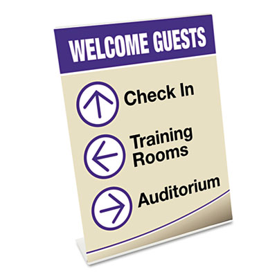 Freestanding durable plastic L-frame holder lets you move signs to where you need them most. Slanted face for easier readability. Literature slides in from the side. Frame Color: Clear; Size: 8 1/2 x 11.