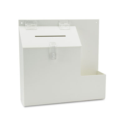 Locked lid secures suggestions or sensitive material. 4 1/8 x 3 1/4 pocket for suggestion cards or envelopes. Mounting hardware and two keys included. Color(s): White; Width: 13 3/4"; Height: 13".