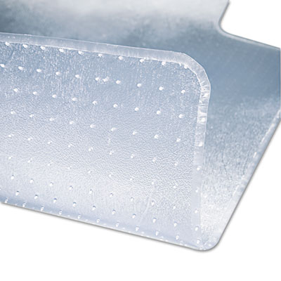 Studded, protective vinyl mat made for low pile carpeting. The transparent color allows the beauty of your carpeting to show through. Unique notched stud design produces a strong grip without piercing or damaging carpet backing. The durable, textured surface is slip-and-scuff resistant. Beveled edge design for easier maneuverability. Mat Type: Chair Mat; Application: Carpet; Material(s): Vinyl.