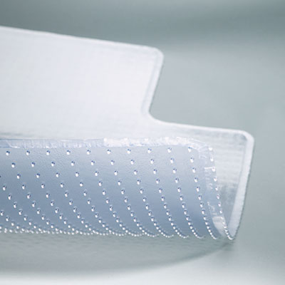This studded protective vinyl chair mat is designed for medium pile carpeting. Made from virgin vinyl compounds that produce a transparent color, allowing the beauty of your carpeting to show through. Beveled edge design for easier manueverability. The unique design of the studs produces a strong grip without piercing or damaging the carpet backing. Mat Type: Chair Mat; Application: Carpet; Material(s): Vinyl.
