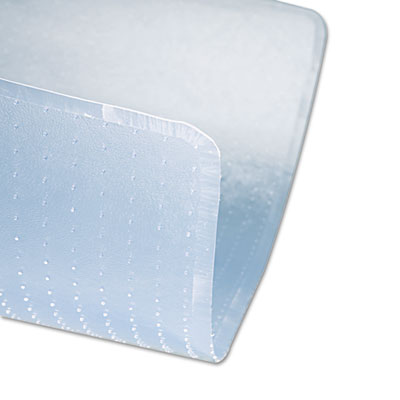 This studded protective vinyl chair mat is designed for medium pile carpeting. Made from virgin vinyl compounds that produce a transparent color, allowing the beauty of your carpeting to show through. Beveled edge design for easier manueverability. The unique design of the studs produces a strong grip without piercing or damaging the carpet backing. Mat Type: Chair Mat; Application: Carpet; Material(s): Vinyl.