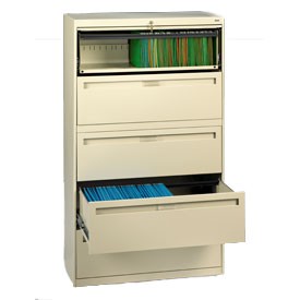 Lateral file cabinets provide improved visibility and easy access to all your files in 1/3 the space required for vertical files. These lateral file cabinets are made with heavy-gauge, furniture quality steel with a superior powder coat finish for scratch resistance. File drawers feature heavy duty ball bearing, full progressive suspensions for quiet operation. Interlocking system allows only one drawer open at a time, eliminating the danger of tipping. The central lock includes two keys to lock all drawers for maximum security. Plastic drawer liner edges allow hanging files without catching. Adjustable file rods accept letter, legal and EDP filing with side-to-side storage. Includes adjustable leveling feet. Fixed Front Cabinets feature all drawers with fixed fronts to offer quiet operation using reinforced, welded inner panel. 5 drawer cabinet features a retracting front door on top drawer. Purchase Front to Back Bars to allow front-to-back filing in drawers for easy viewing of contents.