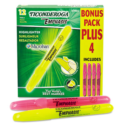 Bright fluorescent ink will not block text even when faxing. Ink dries quickly and will not bleed through paper. Patented thumb cap button allows easy, one-hand cap release. Finish contains MicrobanŽ to inhibit odor and stain causing bacteria. Buy 12, get 4 free! Color(s): Assorted; Tip Type: Chisel.