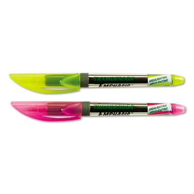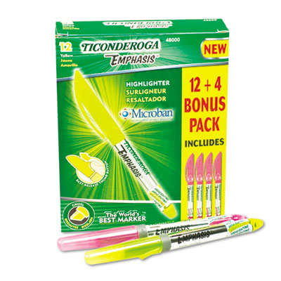 Pocket clip convenience and patented thumb cap button that allows easy, one-hand cap release. Ink will not block text, even when faxing. Dries quickly and will not bleed through paper. Finish contains MicrobanŽ to inhibit the spread of odor and stain causing bacteria. Buy 12 fluorescent yellow, get 4 fluorescent pink free. Color(s): Fluorescent Yellow; Tip Type: Chisel.