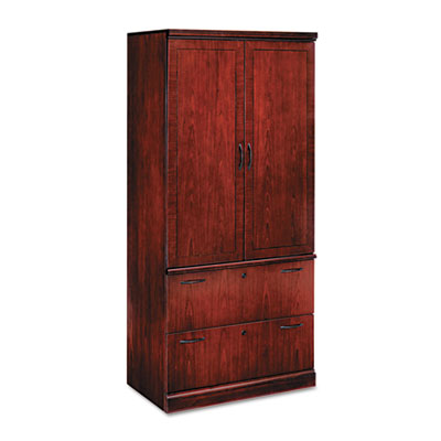 Durable cherry veneer construction. Two-door storage cabinet with two adjustable shelves. File drawers are suspended on full-extension metal ball bearing slides and accommodate letter or legal size hanging files. Profiled drawer pulls. Adjustable floor levelers. Color: Sunset Cherry; Overall Width: 36".