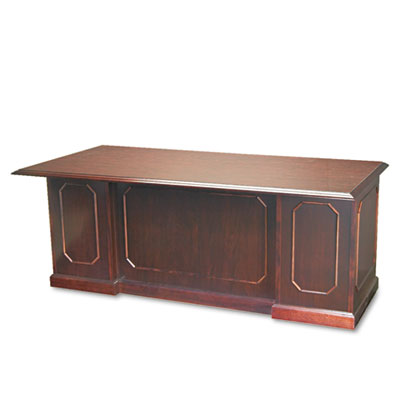Classic elegance that makes a statement in an executive setting. Engraved mahogany finish on solid hardwood base and wood accent moldings; mitered edges. All drawers are suspended on quality metal ball bearing slides; file drawer extends fully and accommodates letter or legal size hanging files, box drawer extends three-quarters. Center drawer with central locking system ensures security. Pullout writing shelf in pedestal creates additional workspace. Decorative swinging bail hardware for a traditional look. Desk and Return sold and shipped separately--ORDER BOTH. Desk, U Bridge and Credenza sold and shipped separately--ORDER ALL THREE. Color: Mahogany; Pedestal Count: 1; Top Shape: Rectangular.