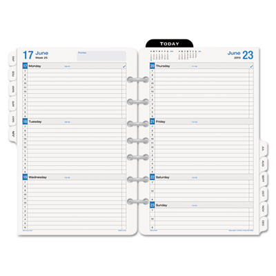Uncluttered format with room for appointments, tasks and notes. Monday to Sunday layout with handy monthly tabs. Space on the front and back of each tab for additional notes and details. Size: 8 1/2 x 5 1/2; Page Color/Theme: White/Blue/Black; Appointment Ruling: Hourly, 7 AM to 6 PM, Mon.-Fri.; Condensed Sat.-Sun..