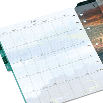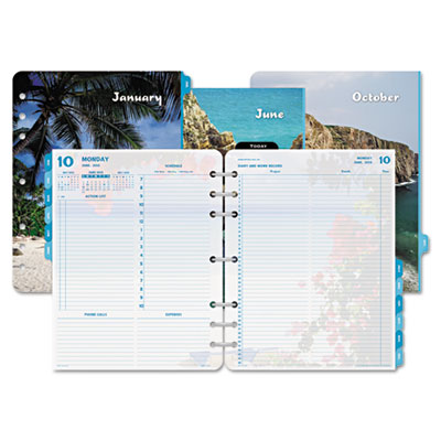 An escape to the seashore with serene coastal photos lightly ghosted to allow daily scheduling and notes. Each month divider has a different full-color image with coastal-color tab. Coordinated page locator with ruler edge. Size: 8 1/2 x 11; Page Color/Theme: CoastlinesŪ; Appointment Ruling: 7 AM to 11 PM.