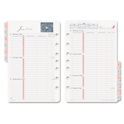 Graceful pink ribbon design. Coordinating monthly tabbed calendar/dividers and page locator. Day-Timer will donate approximately 3%-10% of the retail price to the Breast Cancer Research Foundation. Size: 5 1/2 x 8 1/2; Page Color/Theme: Breast Cancer Awareness; Appointment Ruling: 8 AM to 5 PM.
