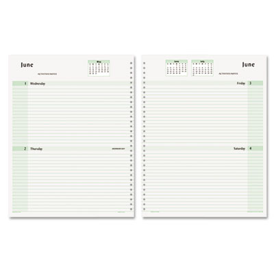 Two days per page layout is perfect for the person who prefers a less structured way of planning. Unique casual format offers ample and equal space for weekdays and weekends. Built-in durable double-sided vinyl pouch for storing notes, receipts, and CD's. Wire binding ensures that pages lay flat when open for easier writing. Past, current and future month reference calendar at top of spread. Four year calendar reference in back of book. Size: 8 1/2 x 11; Appointment Ruling: None.