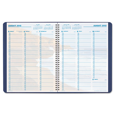 Efficient wirebound planner with refreshing coastal scenes features a vertical weekly format plus tabbed monthly spreads with large daily blocks. Flexible wraparound cover and vinyl storage pocket. Size: 11 x 8; Page Color/Theme: CoastlinesŪ; Appointment Ruling: 15-Min., 7 AM to 10 PM, Mon.-Fri.; 7 AM to 7 PM, Sat.; Untimed Sun..