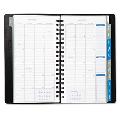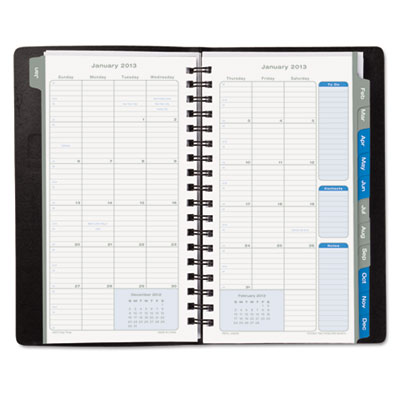 Designed for people who use both paper and electronics. The wirebound planner features monthly tabbed dividers, two pages per month plus a lined note section with a color-blocked task list, graph pages, and perforated blank notes. Ruled daily blocks with past and future reference calendar. Modern, debossed leather-like cover. Size: 3 1/2 x 6 1/2; Page Color/Theme: White/Blue/Gray; Appointment Ruling: None.