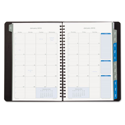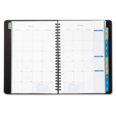 Designed for people who use both paper and electronics. The wirebound planner features monthly tabbed dividers, two pages per month plus a lined note section with a color-blocked task list, graph pages, and perforated blank notes. Ruled daily blocks with past and future reference calendar. Modern, debossed leather-like cover. Size: 5 1/2 x 8 1/2; Page Color/Theme: White/Blue/Gray; Appointment Ruling: None.
