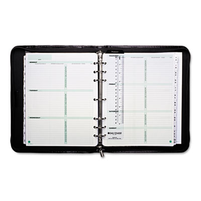 High-quality bonded leather that provides a polished, professional look. Includes a sturdy binder with undated calendar pages, tabbed address/phone directory, tabbed monthly dividers, 24-sheet lined notepad, business/credit card holder, vinyl zip pouch, handy reference pages and a page locator. Size: 8 1/2 x 11; Page Color/Theme: White.